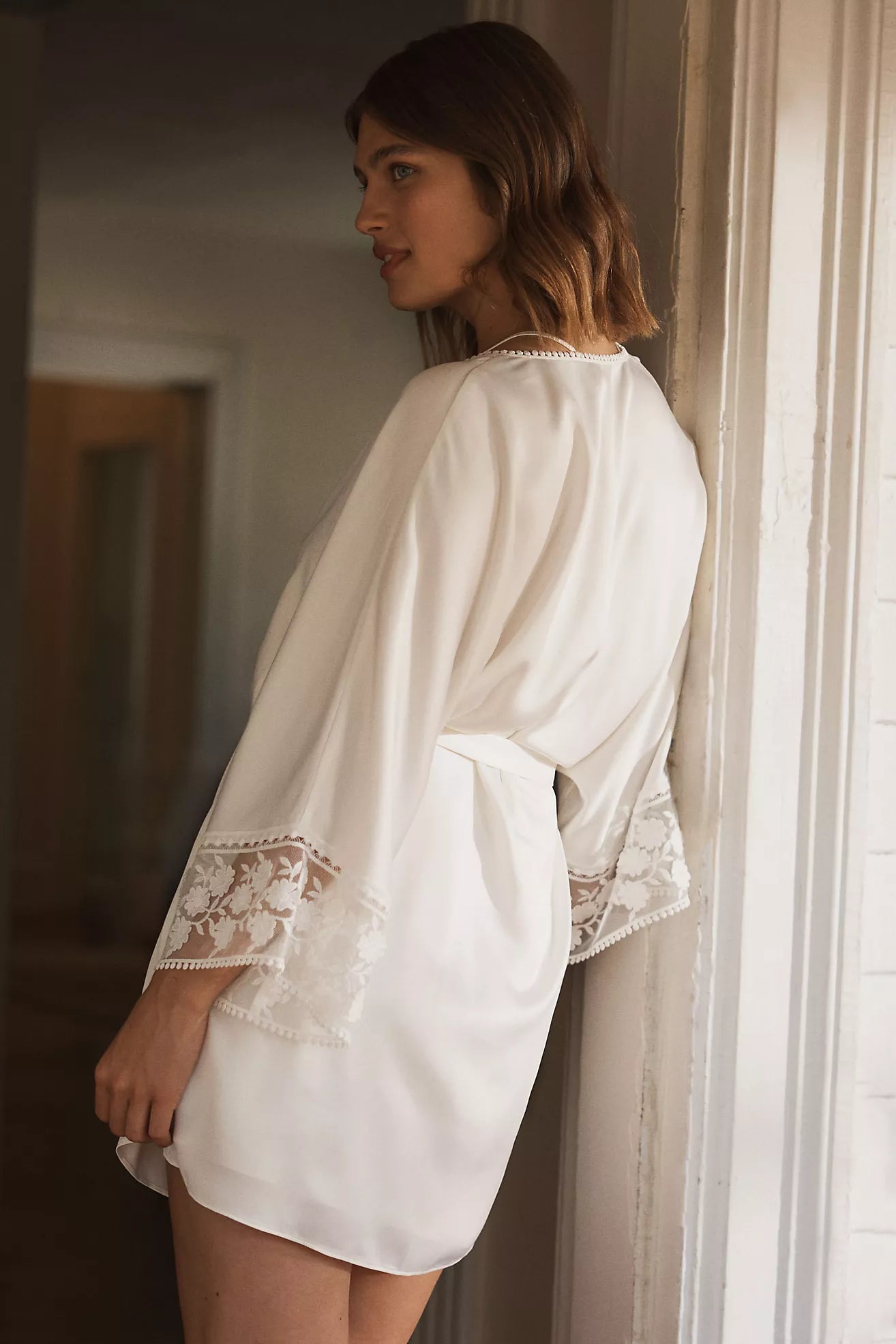 Transform the atmosphere of an evening when you slip into the silky satin Kylie wrap robe with sleeves traced with floral appliqués.